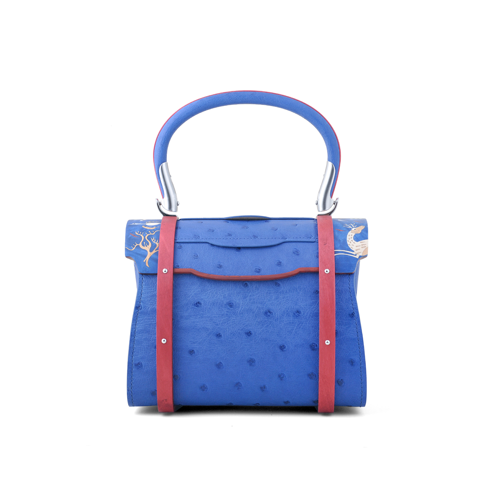 材质:鸵鸟皮(包身) 反绒羊皮(内里) 枫木 或黑胡桃 或赞比亚血檀(包肩及内框架) 瑞士梨木 染色枫木 染色雀眼木等(镶嵌材质) 精抛不锈钢或纯铜镀24K金(五金材质)
